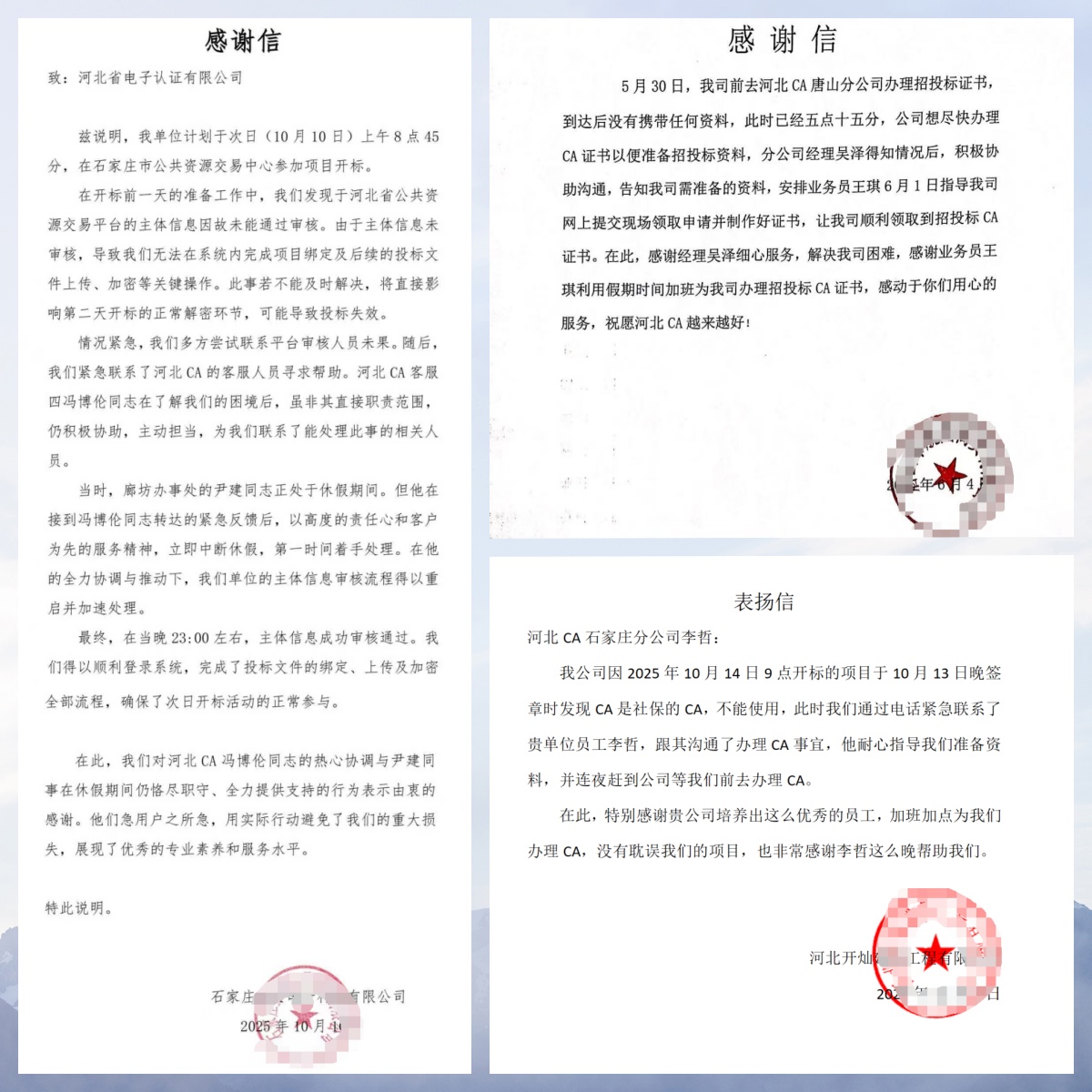 回望2025年,對于河北CA而言,是深耕服務、收獲認可的一年,更是與每一位客戶雙向奔赴、共赴成長的一年。這一年里,我們的辦公桌上,漸漸堆滿了來自四面八方的驚喜——40余封飽含深情的表揚信、10余面熠熠生輝的錦旗,它們來自公共資源領域、醫院機構的合作伙伴,來自深耕實業的大小企業,也來自信賴我們的每一位個人用戶,每一面錦旗、每一行字跡,都是對河北CA服務最真摯的肯定,更是我們前行路上最珍貴的動力。